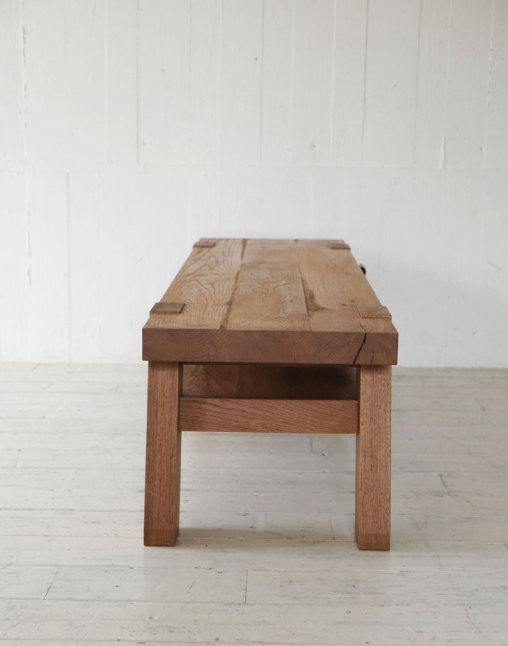 節、割れ、荒木と、あえてつけた段差を生かした分厚いホワイトオーク材の天板に傾斜した太い脚が突き出たデザインが特徴のローボード。通しホゾに打ち込んだクサビが機能と意匠を兼ね添えて大事な要素になっています。
