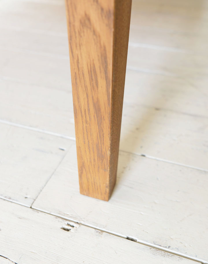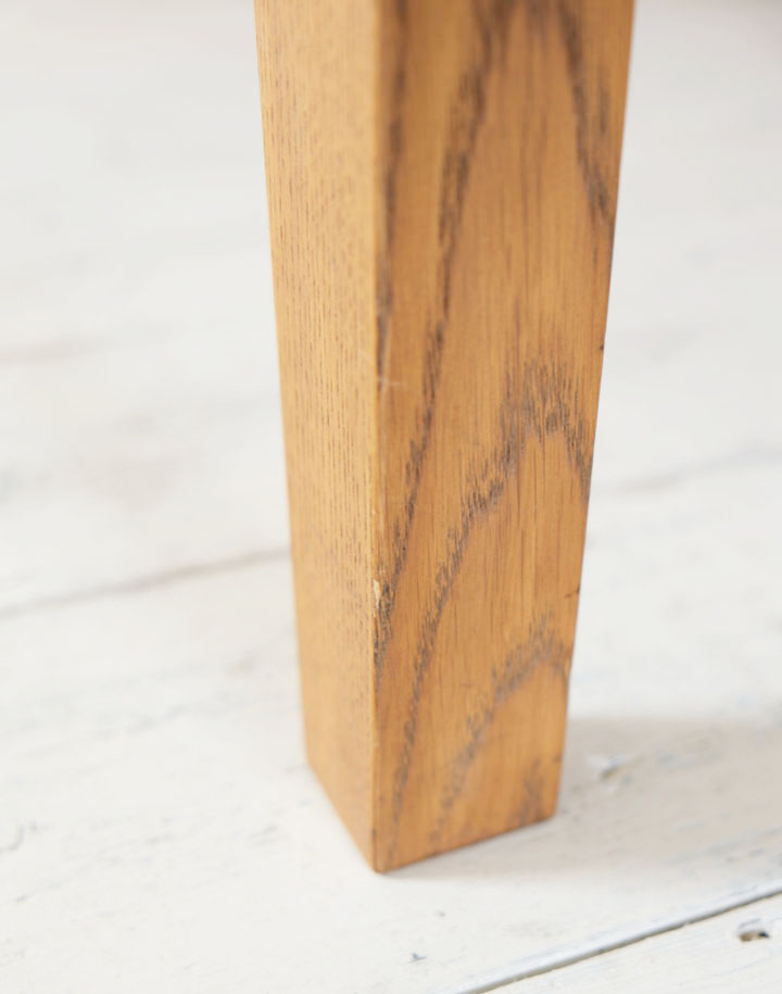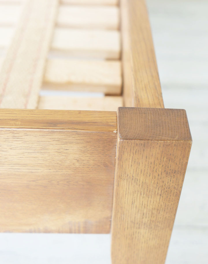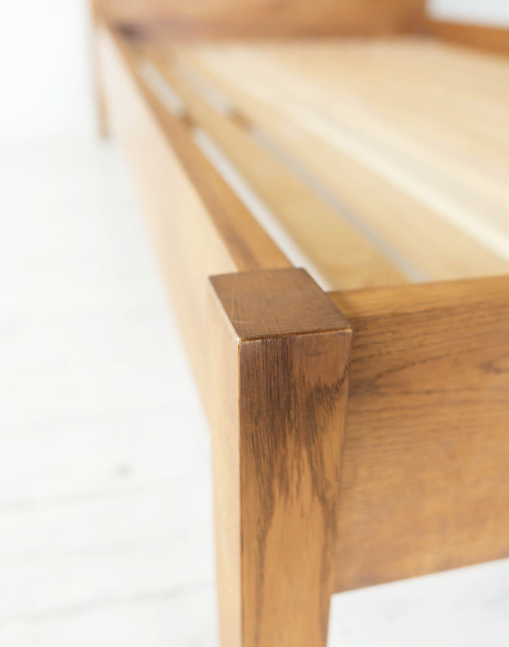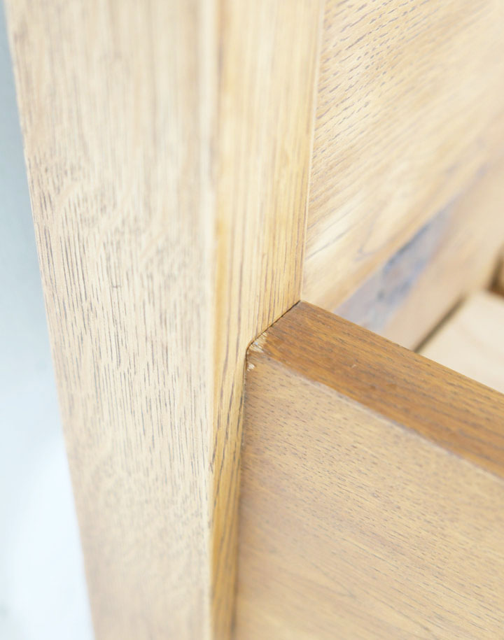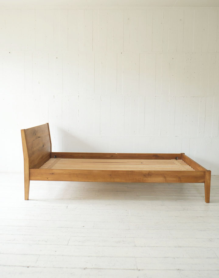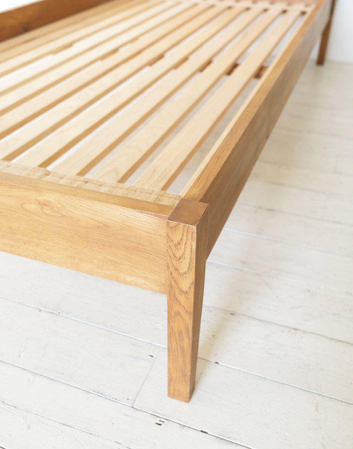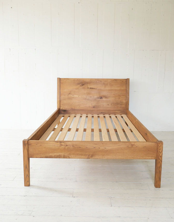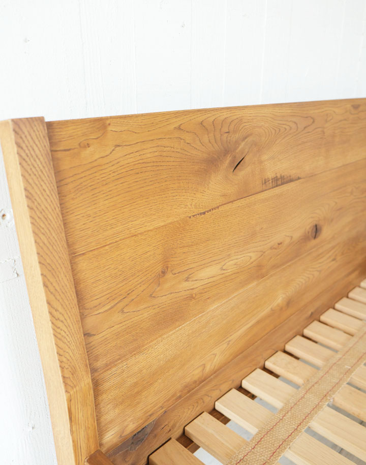 ナラ材の木目がきれいなヘッドボードは少し傾斜をつけて脚に組み込まれています。横からも後姿も眺めていたい程きれいなベッドなので壁に着けて置いてしまうのがもったいないくらいです。