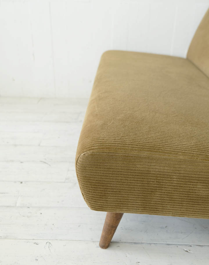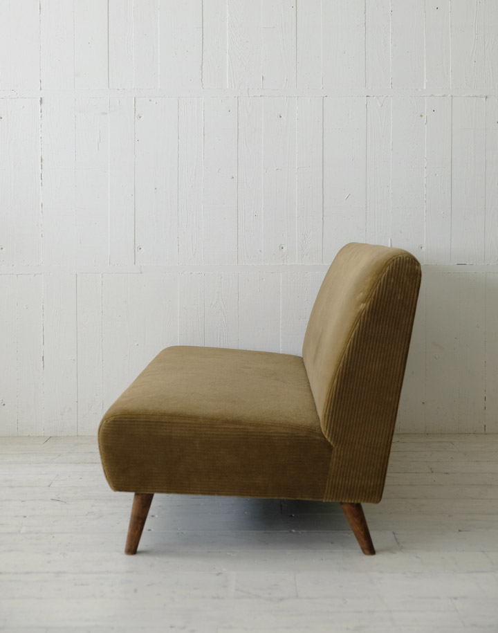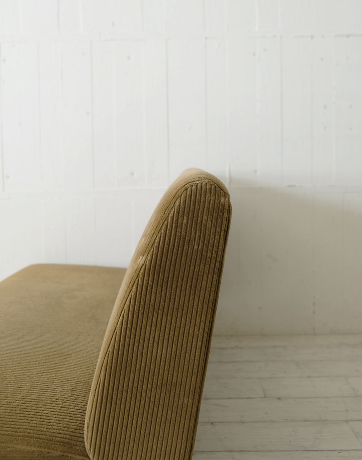 やさしいフォルムと低めのシートがどんなシーンにも馴染みやすい。テーパードされたナラ材の脚が全体の印象を軽やかにしています。肘掛けがないので横からちょっと腰掛けたりギターを弾く時も邪魔になりません。