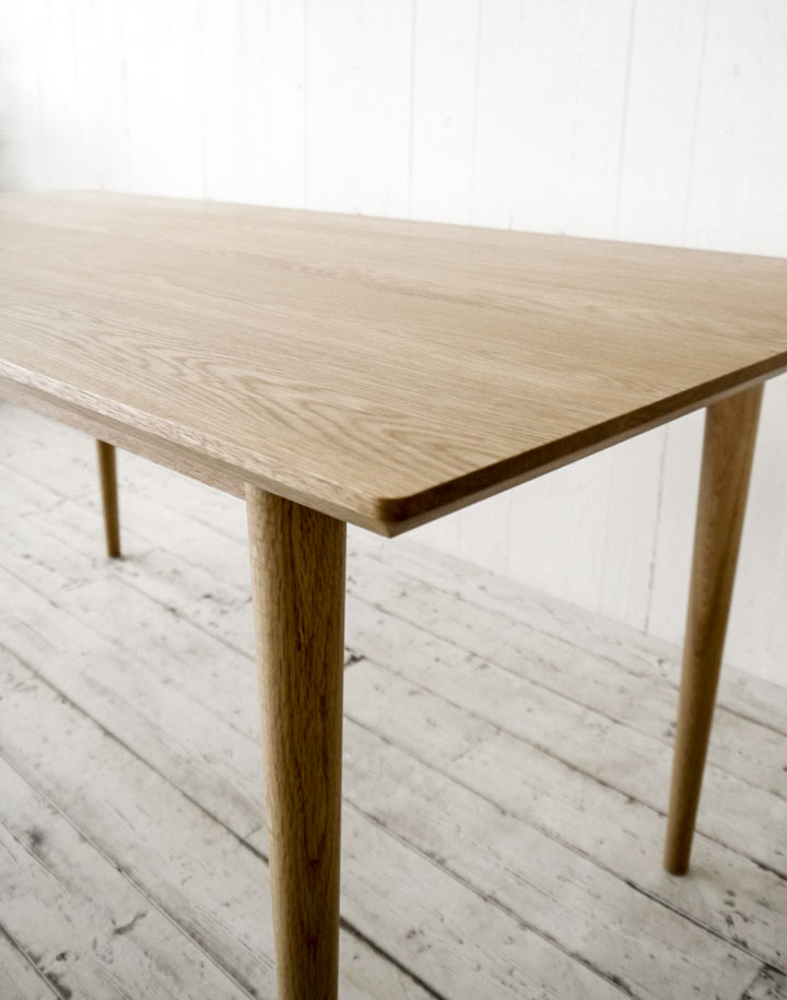 旋盤で挽かれた脚を持つテーブルというなんともネイティブアメリカンの名前のようなネーミングですが、きれいにテーパードされた脚は、天板の大きく削いだ下側の面取りと相まって凛とした佇まいに貢献しています。