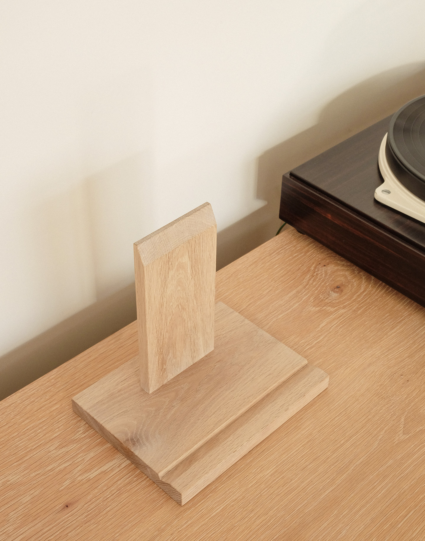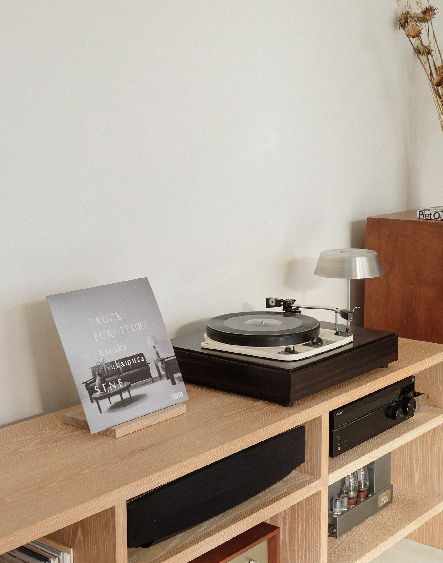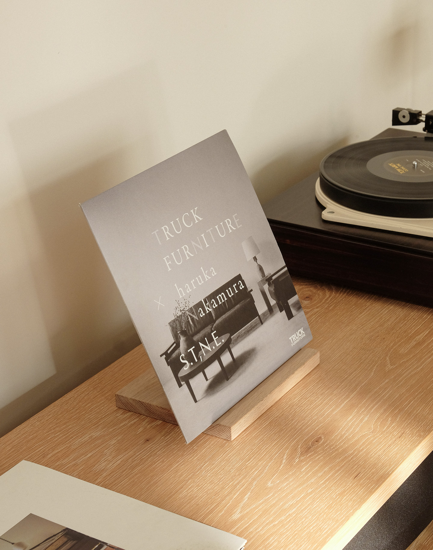 “Now Playing” のレコードをそっと立てるだけで、音だけでなく、ジャケットの佇まいまで楽しめる。